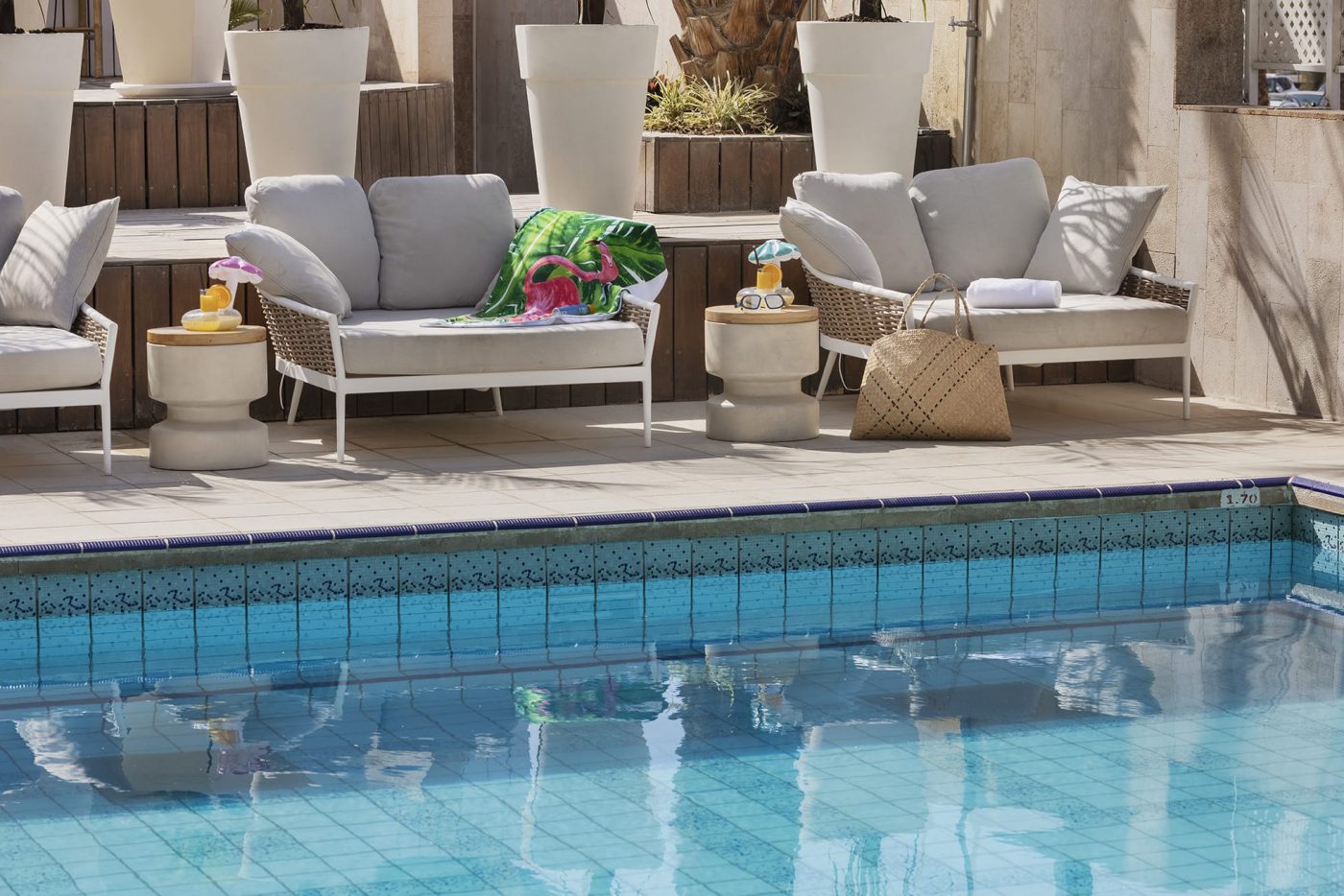 לצד המלון, נמצאת הבריכה אשר עברה לאחרונה שיפוץ ויזואלי מקיף, במתחם תמצאו כמובן גם, מיטות שיזוף רחבות ידיים ושמשיות ענק פזורות סביבה.